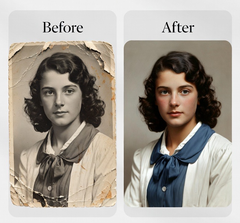 Full restoration of damaged/old photos: tear repair, colorization, grain removal, print optimization. Bring priceless memories back.